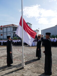 Upacara peringatan Hari Santri Nasional diakhiri dengan pembacaan doa bersama dan menyanyikan lagu “Mars Hari Santri” yang menggema penuh semangat di seluruh lapangan. Para santri tampak antusias mengikuti jalannya kegiatan, mengenakan seragam putih dan sarung khas pesantren yang menjadi simbol kesederhanaan dan kesucian niat. Suasana haru dan bangga terasa ketika bendera merah putih dikibarkan, menandakan bahwa semangat santri untuk mencintai agama dan tanah air tetap menyala.